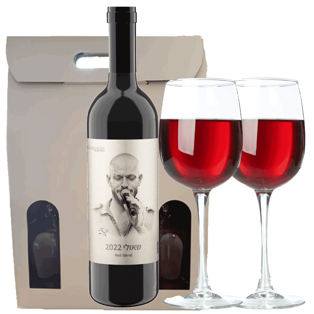 מארז מתנה הכולל: בקבוק יין, זוג כוסות קריסטל.