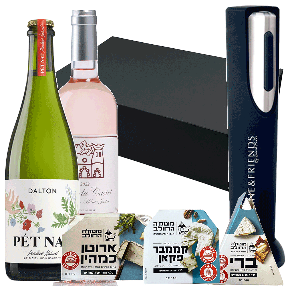 מארז יין וגבינות הכולל יין לבן, יין רוזה, שלוש גבינות של מוטק'ה החולב ופותחן יין חשמלי.