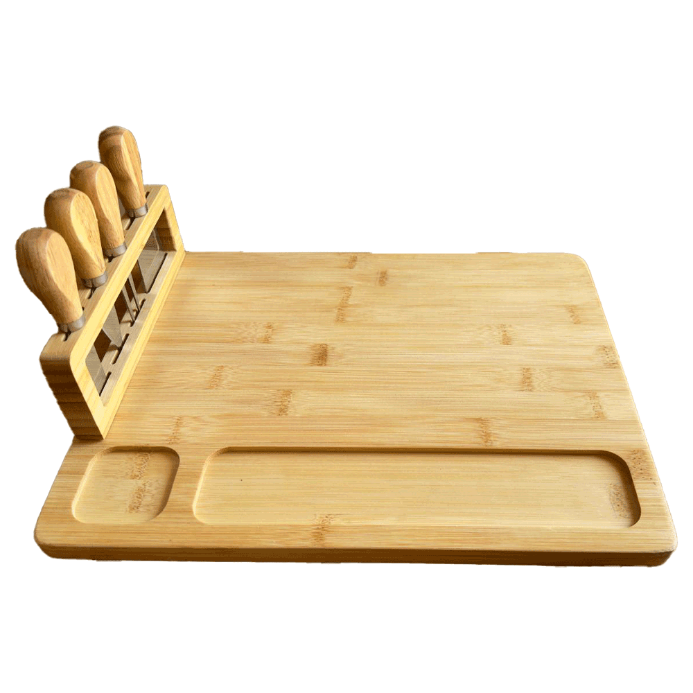 מגש עץ במבוק עם סט ארבעה סכינים מיוחדות לגבינות קשות ורכות.